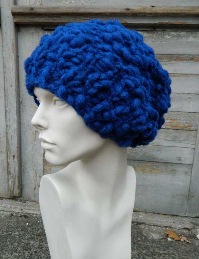 Świetna, ogromniasta (dużo jej na głowie) czapa w stylu HIPSTERSKIM :). Jest grubaśna, ciepła, mięsista i bardzo przyjemna w dotyku. Kolor to mocna, świetlista ultramaryna (chaber). Efekciarska guzowata włóczka o składzie: 74% wełna, 17% akryl, 9% polyamid. Formować można ją w dowolny sposób, wg upodobania (trzeba znaleźć sobie na nią swój sposób). Obwód uniwersalny, najlepiej ok 56-59cm, głębokość 32cm..