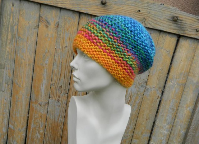 Gruba czapa w wesołym melanżu / styl BOHO:). Fasonowo - standardowy krasnal do formowania na klika sposobów, wg upodobania. Fajna gatunkowo włóczka z minimalnym włoskiem, mieszanka wełny (10%) z mohairem (10%) i akrylem (80%). Jest dosyć gruba, robiona mięsistym niezbyt ścisłym ściegiem i bardzo miła w kontakcie ze skórą. Rozmiar najlepiej na głowę o obwodzie ok 56-58cm, głębokość 29cm.