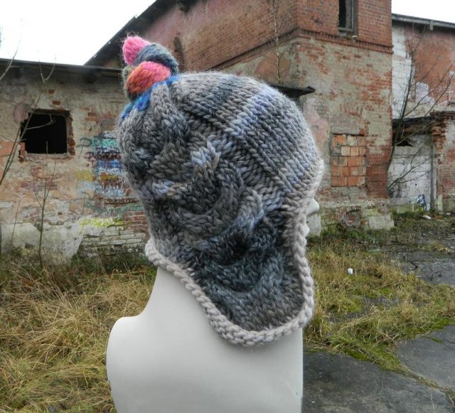 Zawadiacka melanżowa czapa - pilotka z warkoczami . zamiast pompona kolorowy fikuśny węzełek. Wydziergałam ją ze świetnej gatunkowo hiszpańskiej włóczki, mieszanka wełny z akrylem. Jest gruba, mięsista, ciepła, przyjemna w kontakcie ze skórą. Na głowie prezentuje się superowo :))). Rozmiarowo najlepiej na głowę o obwodzie ok 56-59cm,