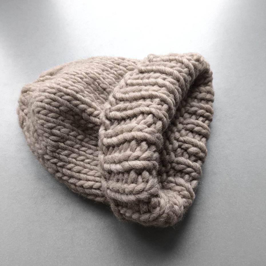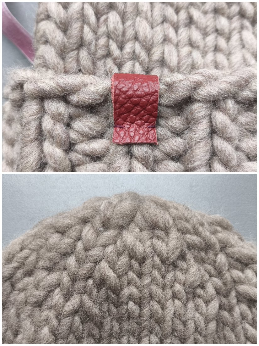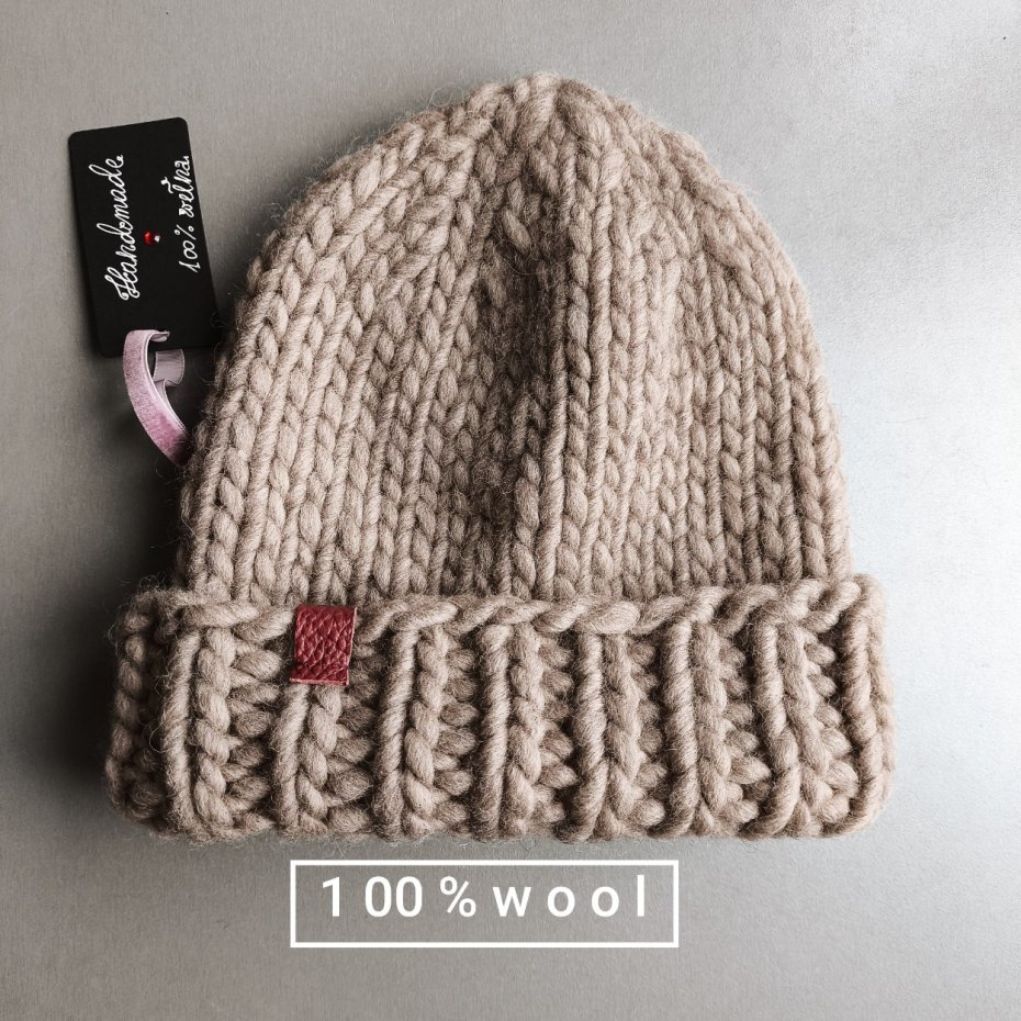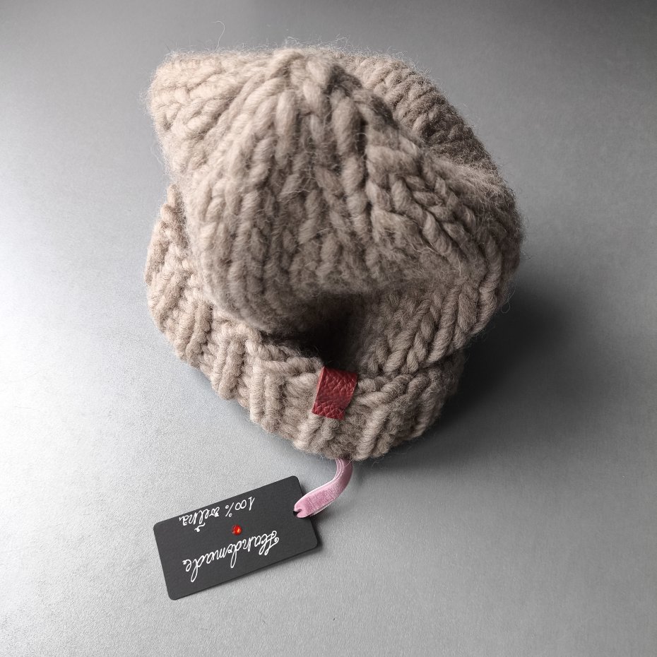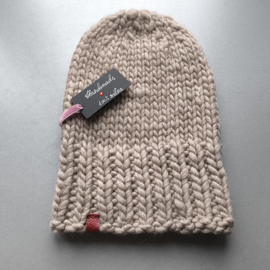 Ciepła, gruba czapa w kolorze beżu z dodaną naszywką ze skóry. Naszywkę można wymienić na inną przed zakupem :).