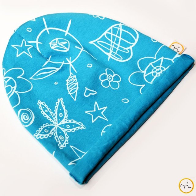 Czapeczka z dzianiny z nadrukiem we wzorki. Możliwość zamówienia dowolnego rozmiaru (w zamówieniu proszę napisać obwód główki maluszka).