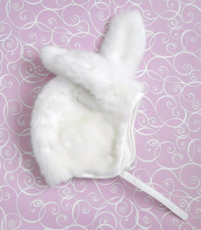 kolor - biel mleczna. Urocze uszka, bardzo milutka w dotyku. Paseczek pod brodę na rzep. Można prać w wodzie.