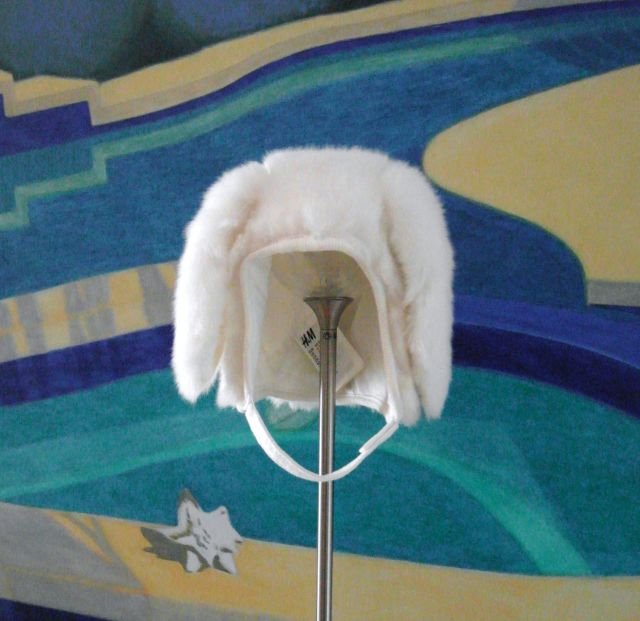 kolor - biel mleczna. Urocze uszka, bardzo milutka w dotyku. Paseczek pod brodę na rzep. Można prać w wodzie.
