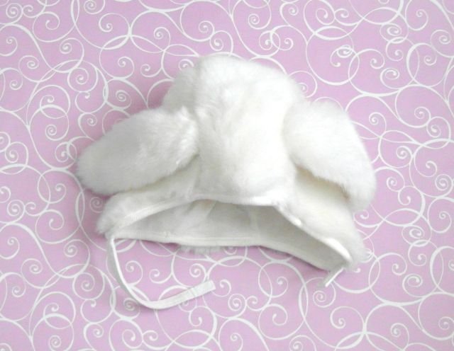 kolor - biel mleczna. Urocze uszka, bardzo milutka w dotyku. Paseczek pod brodę na rzep. Można prać w wodzie.