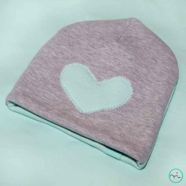 Śliczna czapeczka z szarej oraz miętowej elastycznej dzianiny. Czapeczka na główkę o obwodzie 42 cm. Możliwość zamówienia dowolnego rozmiaru. Czas oczekiwania na wykonanie zamówienia do 5 dni.