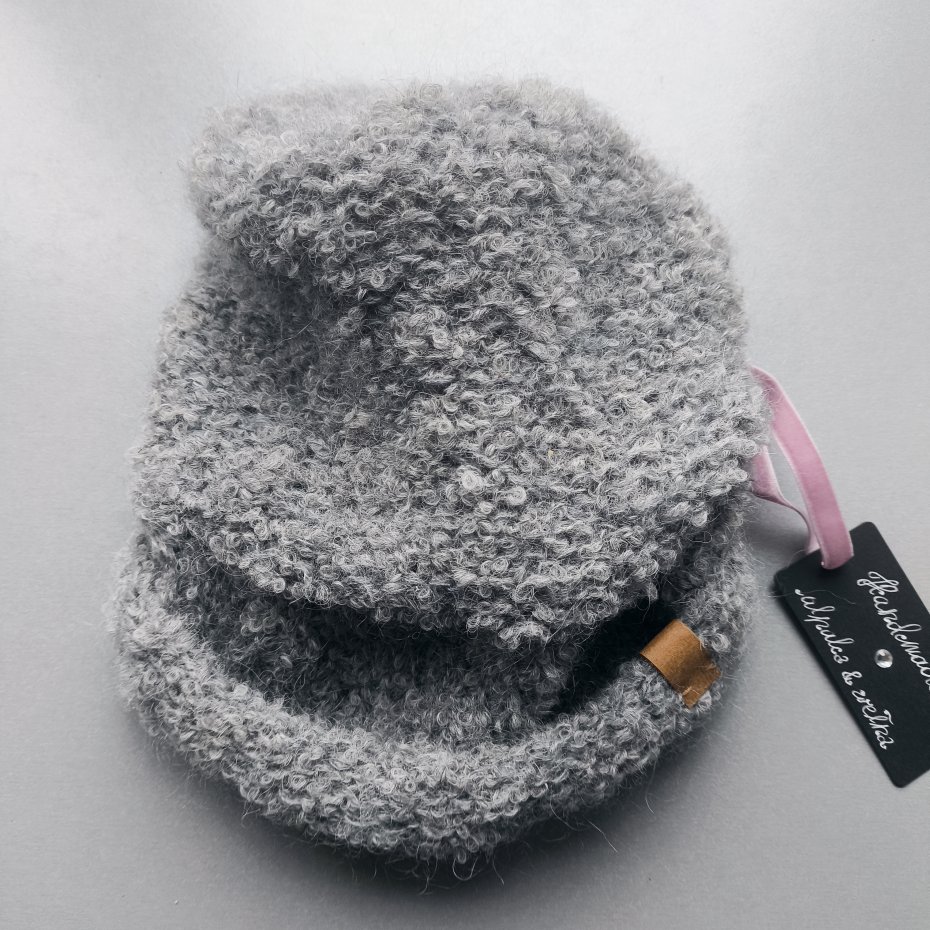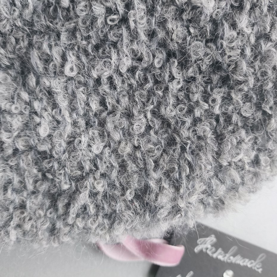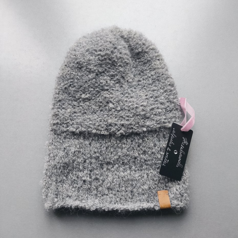 Czapka wykonana ręcznie z połączenia dwóch wełen: alpaki boucle oraz moheru z jedwabiem. Skład: 80% alpaka, 15% wełna z Peru, 5% poliamid, 75% moher, 25% jedwab. Posiada certyfikat oeko-tex.