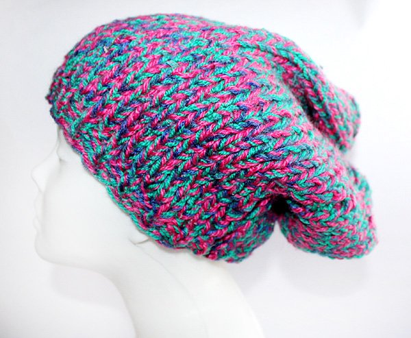 Luźna czapka wykonana na drutach z akrylu w pojedynczym egzemplarzu. Projekt i wykonanie: Assembleage.