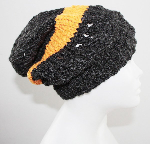 Smerfowa czapka w kolorze brudnej,grafitowej czerni z dodatkiem musztardowego pomarańczu. Projekt i wykonanie: Assembleage