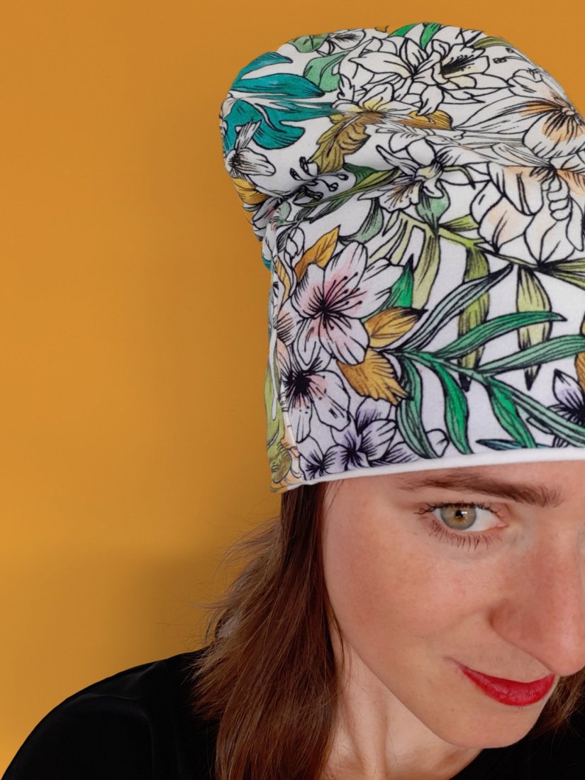 Tagi: #bawełna 100%, #cienka czapka, #grafika artystyczna, #wzór kwiatowy