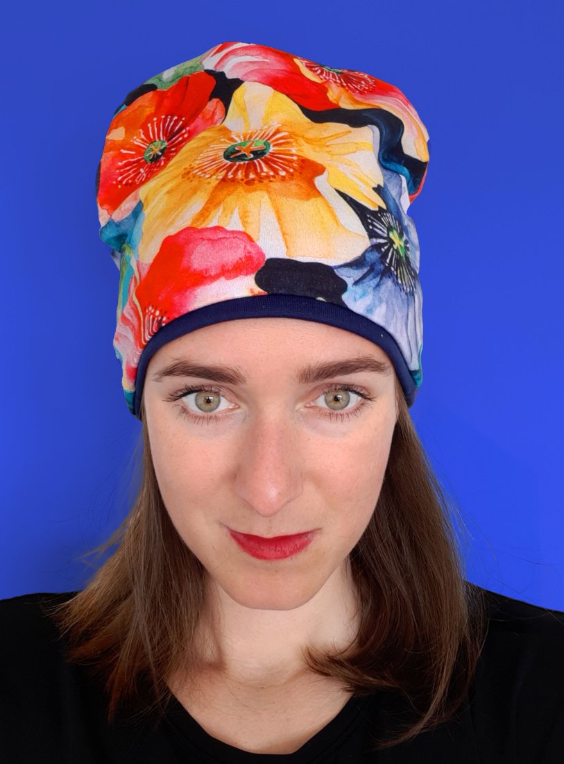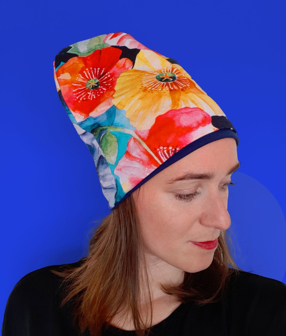 Ta czapka to mój wynalazek na chłodne letnie poranki, jesienne spacery, coraz cieplejsze zimy - cienka, ale trzyma ciepło jak trzeba, wykonana jest z dwóch warstw elastycznej bawełny. Uwaga! Czapka jest kolorowa! a kolory są nasycone i rzucają się w oczy! Idealne do stonowanej stylizacji ;