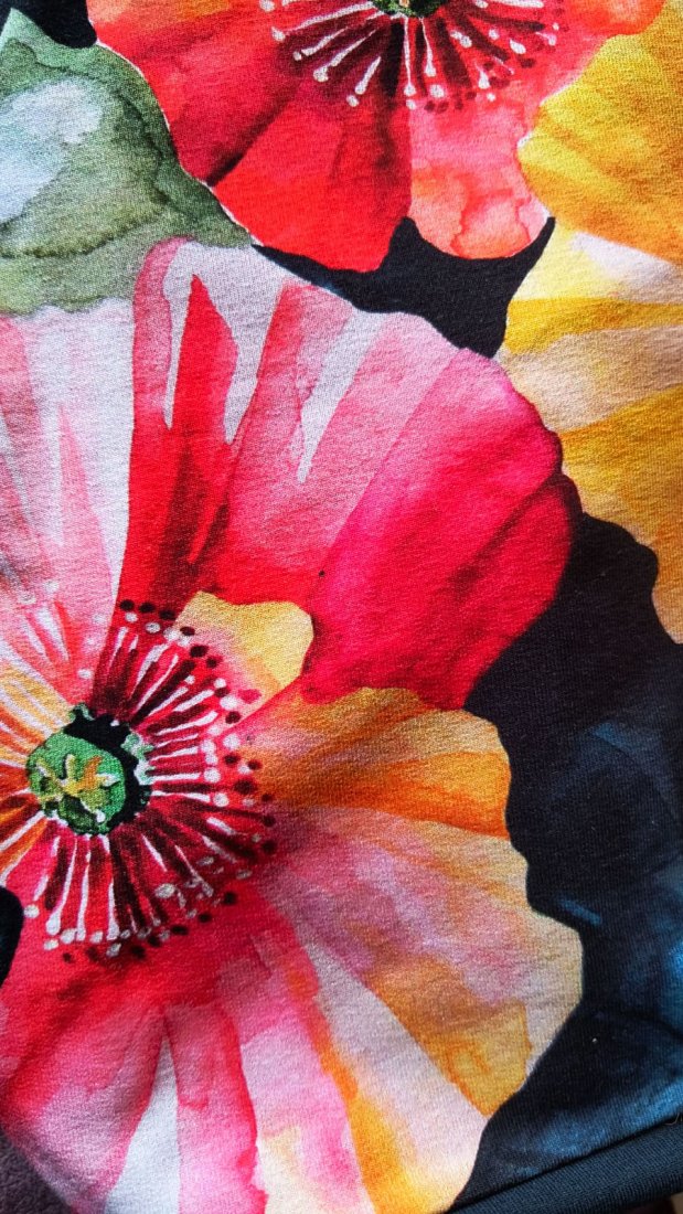 Każda sztuka ma mój własny nadruk, przeniesiony prosto z akwareli, które maluję (więc trochę jakbyś nosiła kawałek obrazu na głowie - część z nich jest jeszcze dostępna do zawieszenia na ścianie!). Robię je w mikroskopijnej ilości - od 2 do 4 sztuk - więc nie spotkasz nikogo w takiej samej!