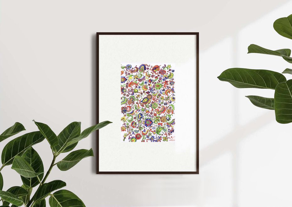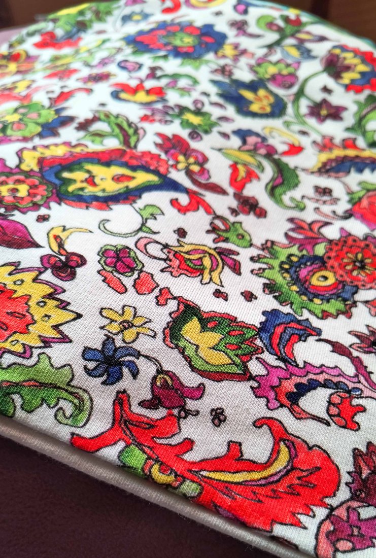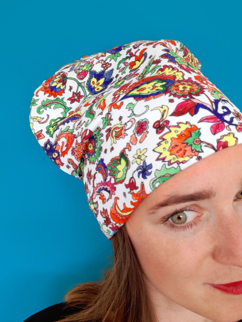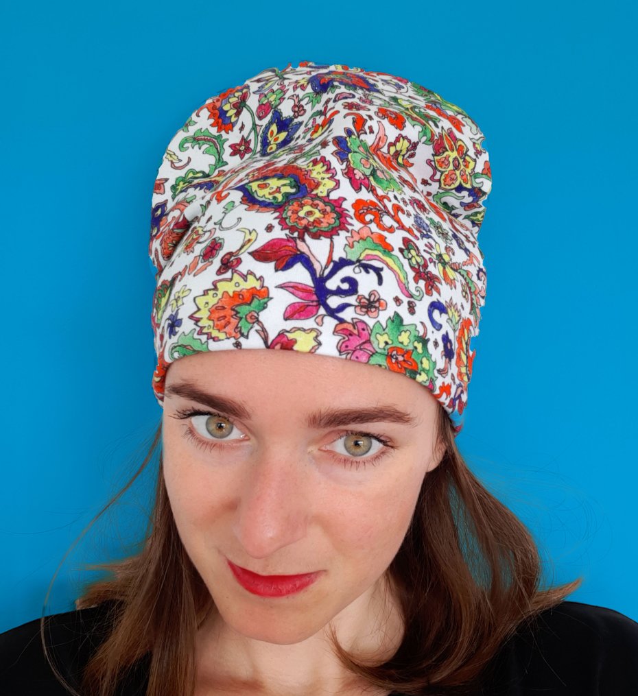 Każda sztuka ma mój własny nadruk, przeniesiony prosto z akwareli, które maluję (więc trochę jakbyś nosiła kawałek obrazu na głowie - część z nich jest jeszcze dostępna do zawieszenia na ścianie!). Robię je w mikroskopijnej ilości - od 2 do 4 sztuk - więc nie spotkasz nikogo w takiej samej!