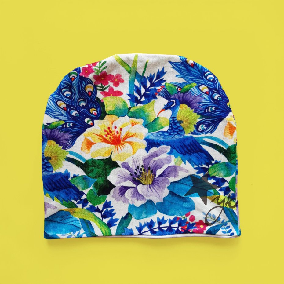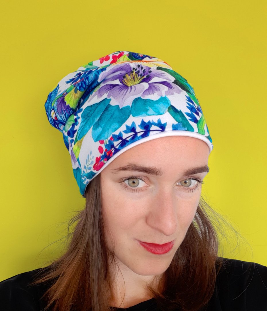 Tagi: #bawełna 100%, #cienka czapka, #grafika artystyczna, #wzór kwiatowy