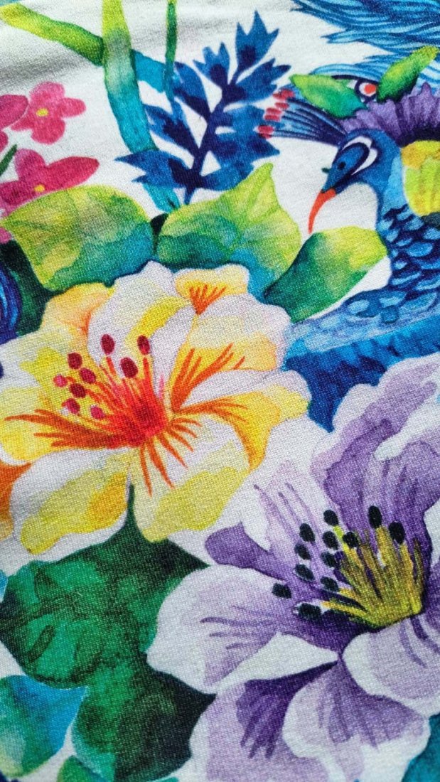 Każda sztuka ma mój własny nadruk, przeniesiony prosto z akwareli, które maluję (więc trochę jakbyś nosiła kawałek obrazu na głowie - część z nich jest jeszcze dostępna do zawieszenia na ścianie!). Robię je w mikroskopijnej ilości - od 2 do 4 sztuk - więc nie spotkasz nikogo w takiej samej!