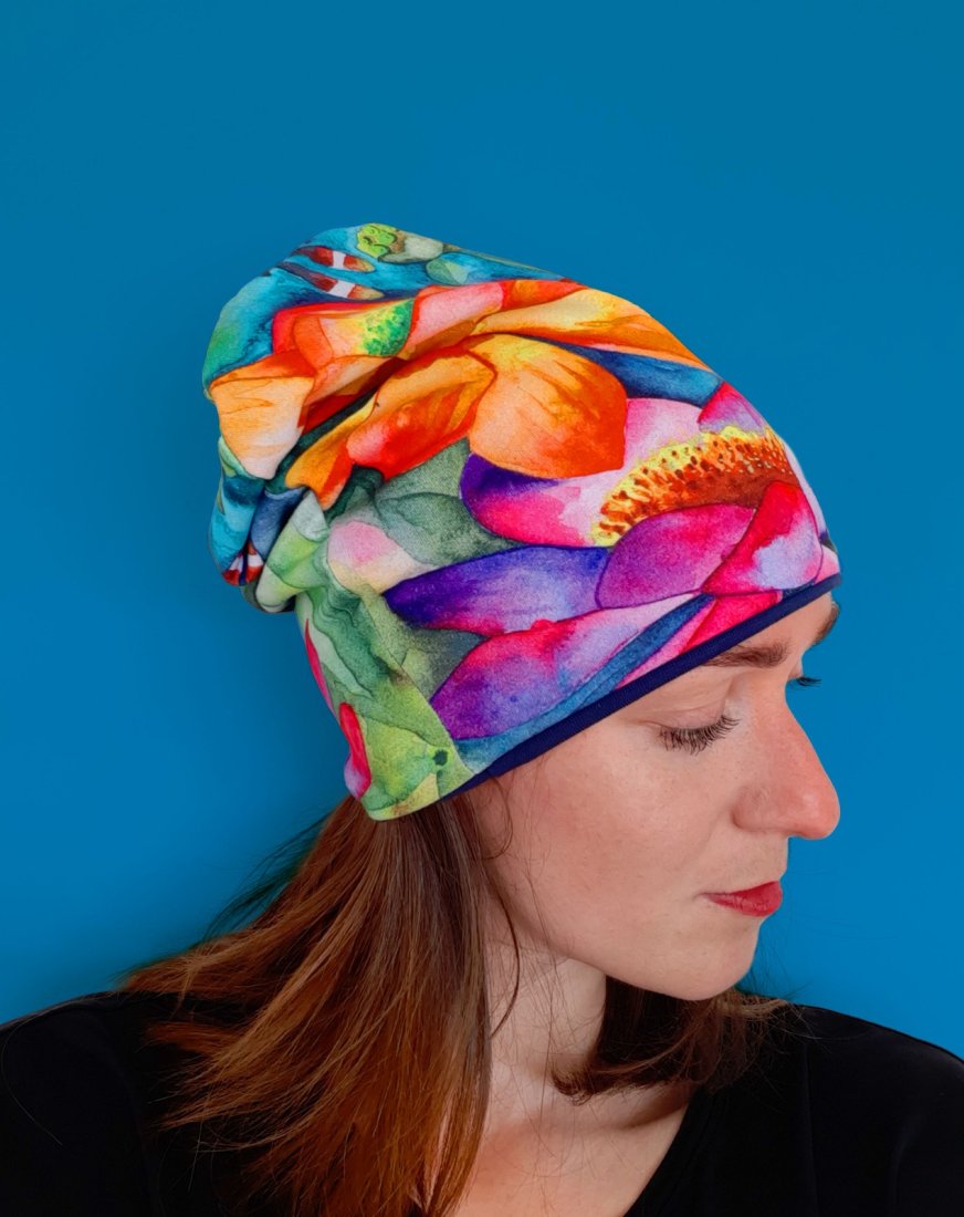 Każda sztuka ma mój własny nadruk, przeniesiony prosto z akwareli, które maluję (więc trochę jakbyś nosiła kawałek obrazu na głowie - część z nich jest jeszcze dostępna do zawieszenia na ścianie!). Robię je w mikroskopijnej ilości - od 2 do 4 sztuk - więc nie spotkasz nikogo w takiej samej!