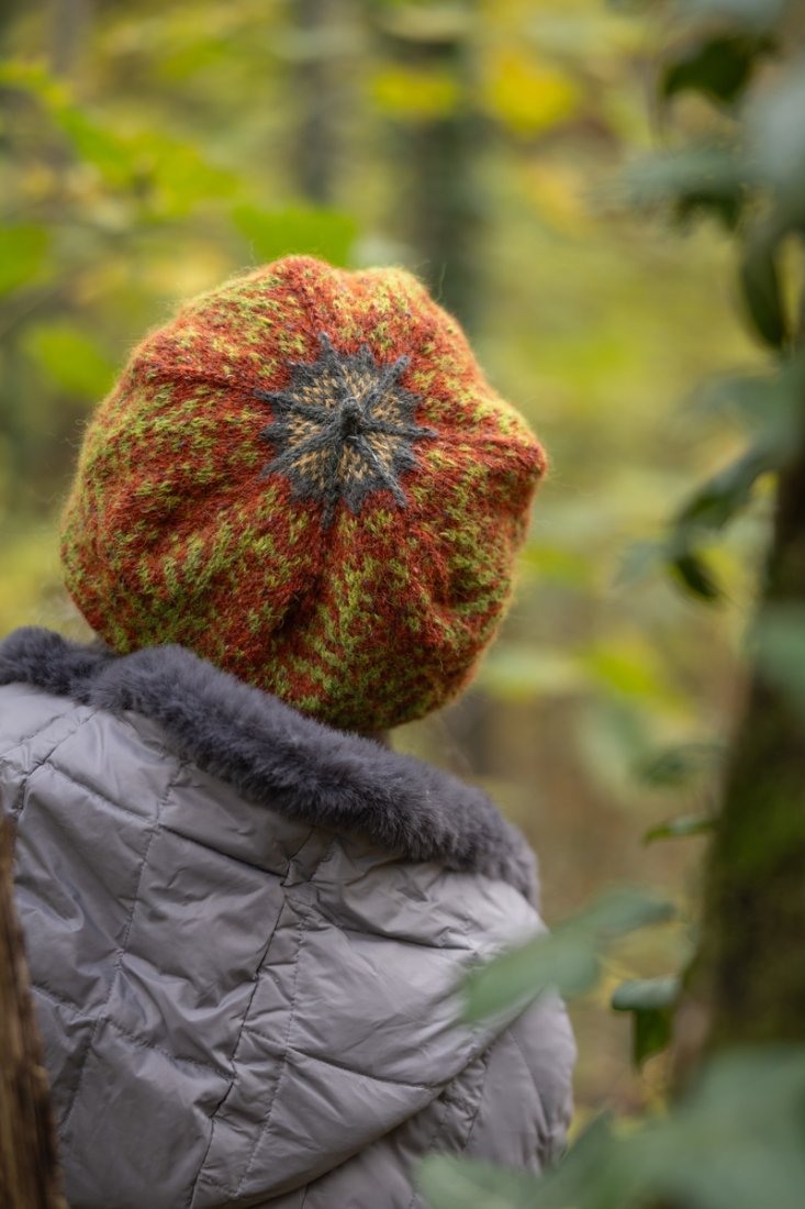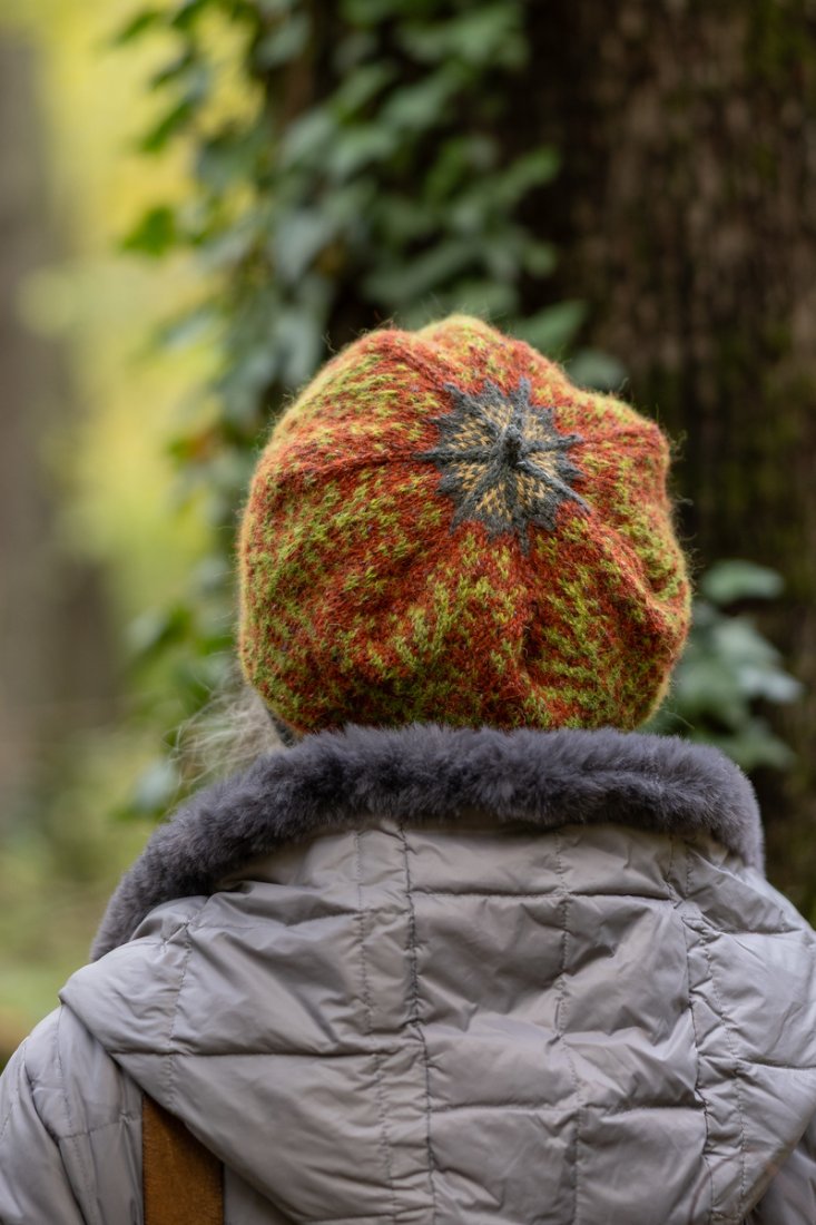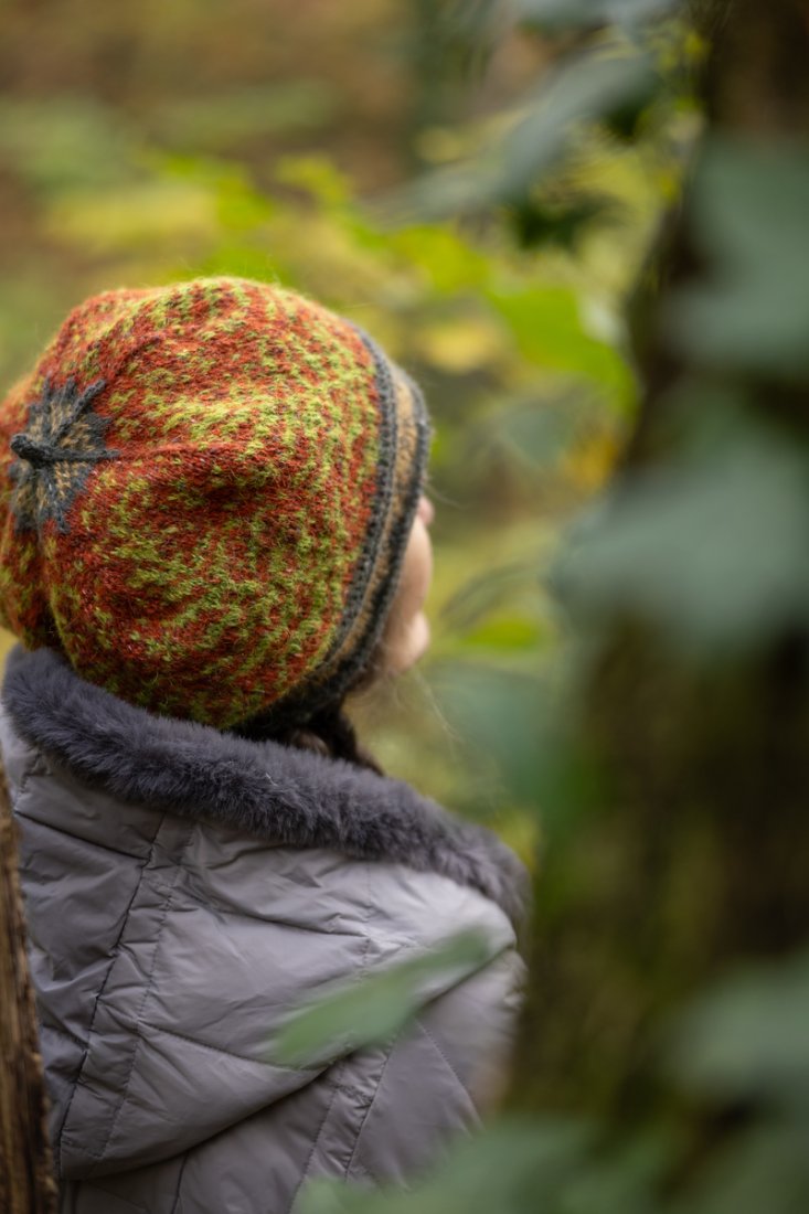 Ma kształt fantazyjnego beretu. Powstała z włóczki o szlachetnym składzie (wełna owcza, wełna alpaki, wiskoza), częściowo filcowanej, która pozwala uzyskać dzianiny ciepłe i miękkie o nieco rustykalnym charakterze. Brzeg beretu wykonany został z podwójnej dzianiny, co daje dodatkową izolację termiczną. Unikatowy żakardowy wzór jest pochwałą nie tylko zielonych pióropuszy paproci, ale także "szarych eminencji" lasu - setek maleńkich motylków, które unoszą się z paprociowej gęstwiny, gdy nią poruszysz.
