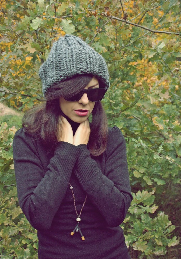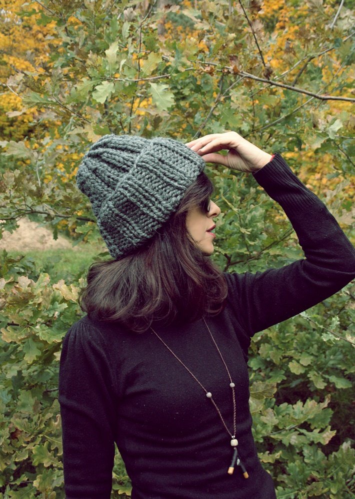 Ręcznie wykonana gruba, mięsista czapka w kolorze szarym.