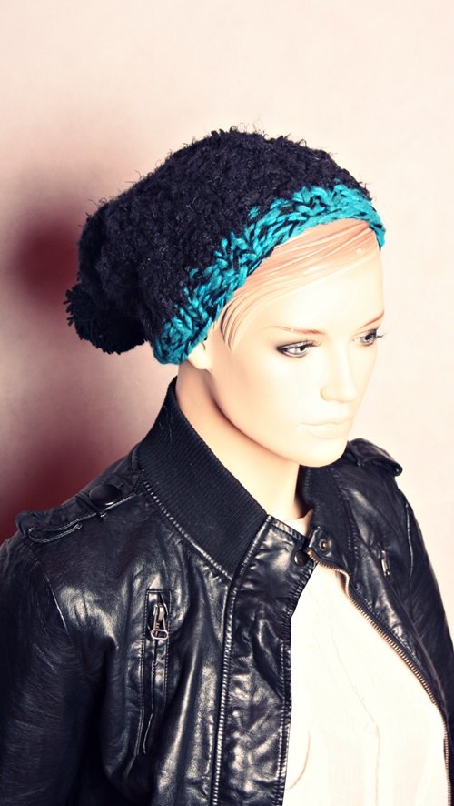 Ręcznie wykonana czapka z pomponem, kolor czarny,zakończona turkusowym paskiem,.pojedynczy egzemplarz,.Rozm uniwersalny