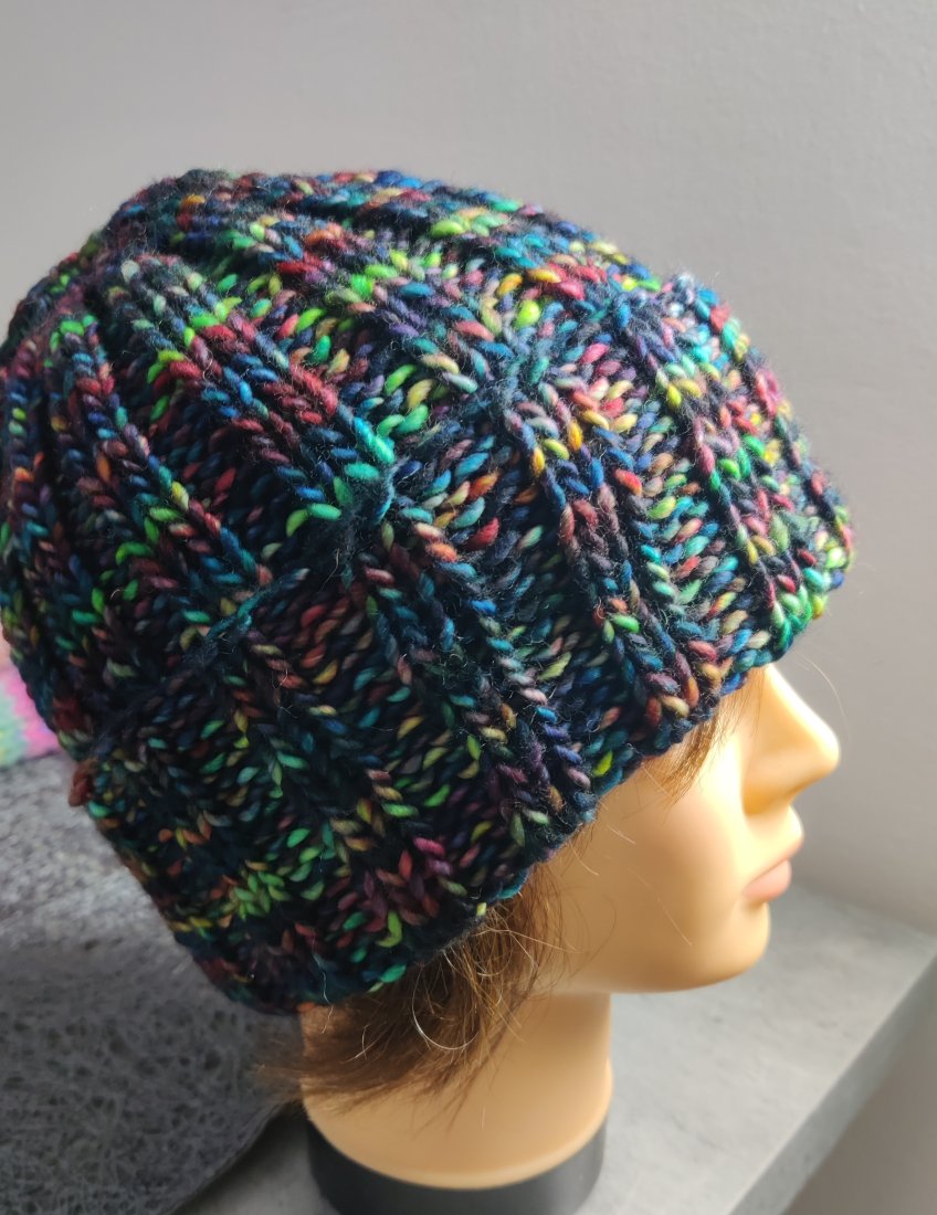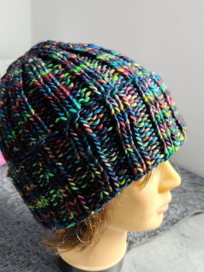 Czapka wywijania tzn. podwójny sciagacz unisex ręcznie zrobiona z ręcznie farbowanej wełny z merynosów.