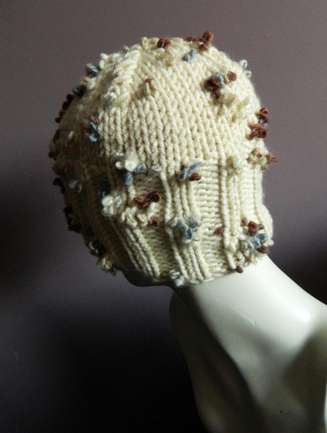 Grubaśna, fajna czapa o tradycyjnym fasonie. Efektowna włóczka w kolorze ecru/wanilia (+ brąz, beż i szarość). Skład: 25% wełna, 70% akryl, 5% polyamid. Świetnie układa się na głowie, jest mięsista i ciepła. Najlepiej będzie pasowała na głowę o obwodzie ok 56-58cm, głębokość 21,5cm.