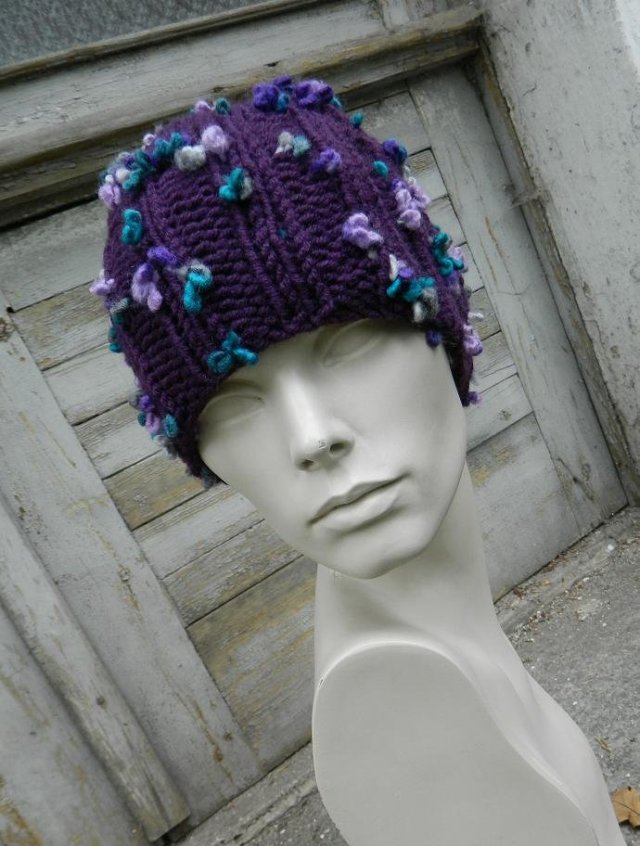 Grubaśna, fajna czapa o tradycyjnym fasonie. Efektowna włóczka z wystającymi guzkami. Skład: 25% wełna, 70% akryl, 5% polyamid. Świetnie układa się na głowie, jest mięsista i ciepła. Najlepiej będzie pasowała na głowę o obwodzie ok 56-58cm, głębokość 21,5cm.