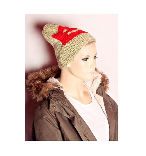 Ręcznie wykonana czapka z czerwonym wzorem -usmiechnieta buźka