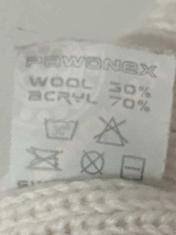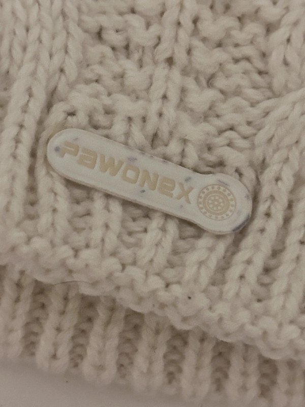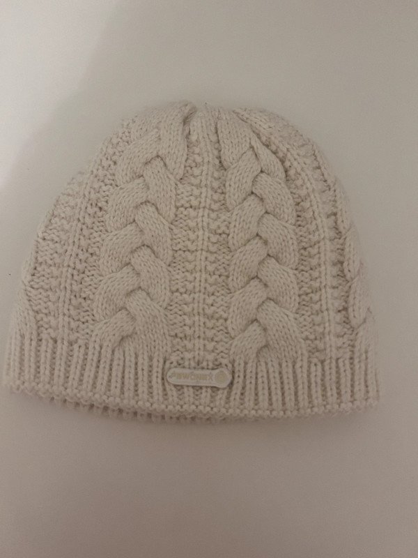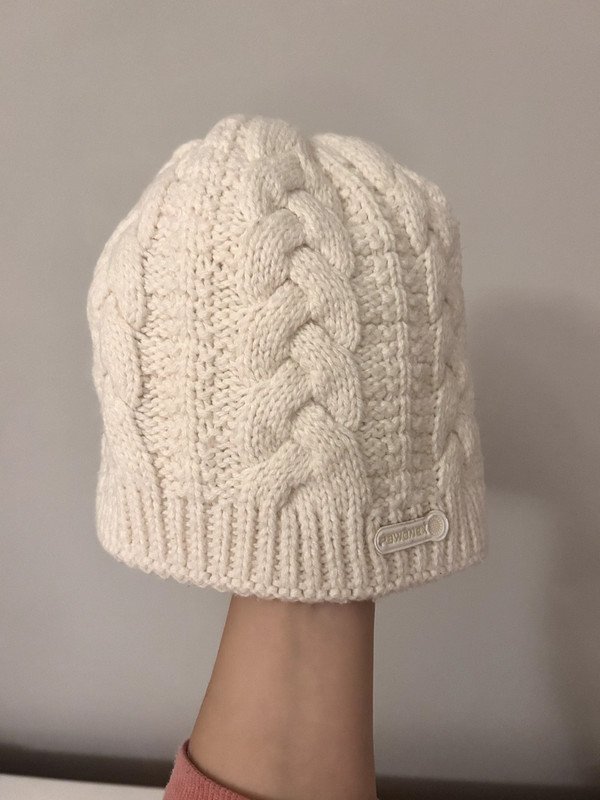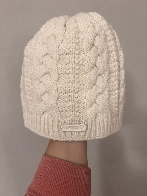 Kremowa czapka firmy Pawonex, 30 % wełna, idealna na zimę. Wzór z warkoczami.