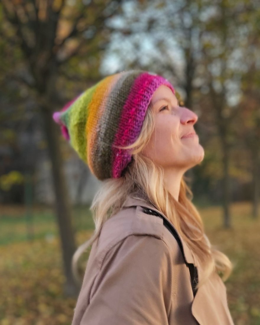 Prosta, lekka, bezszwowa czapka wykonana na drutach z wysokiej jakości włóczki wełnianej japońskiej firmy Noro.