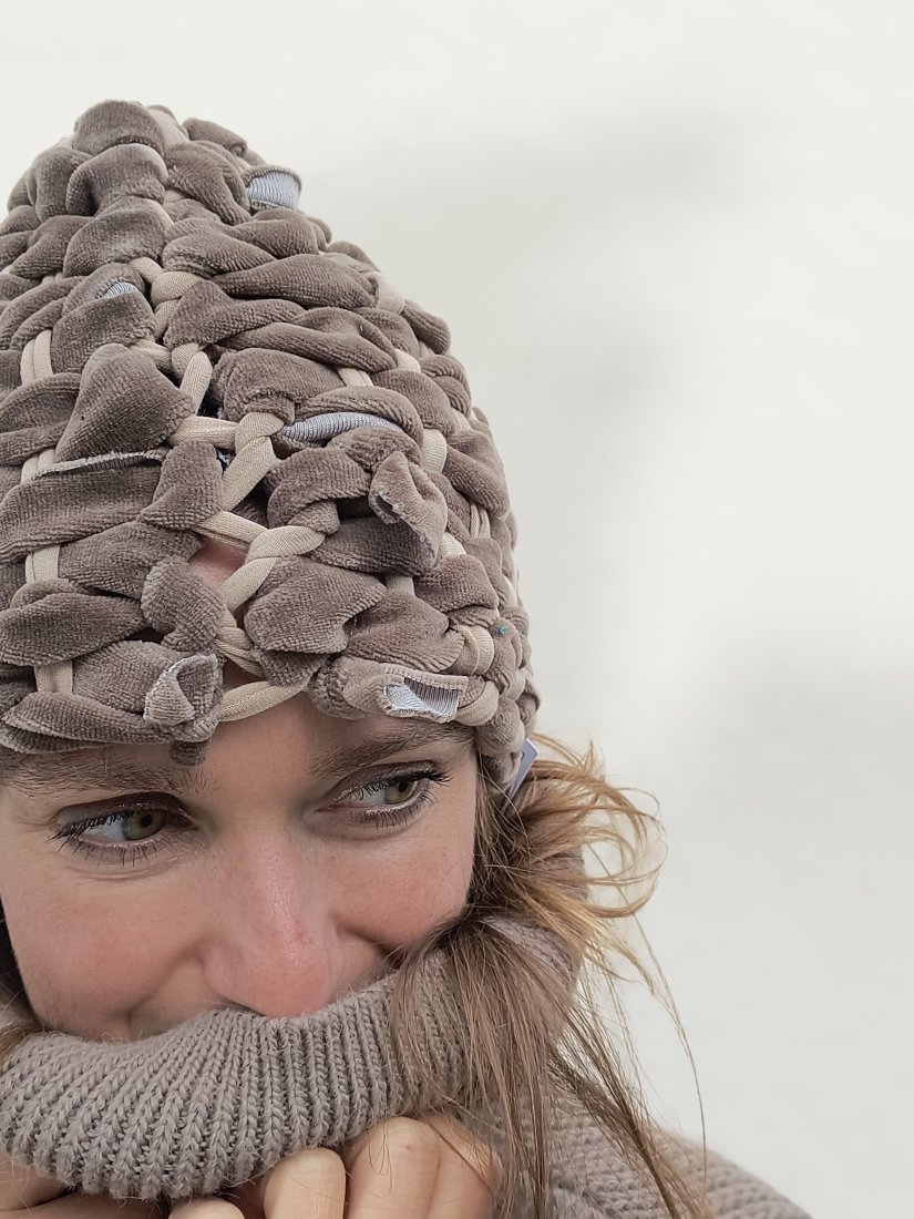 Wszystkie moje czapki tkam ręcznie na krośnie z pociętych pasów tkanin.