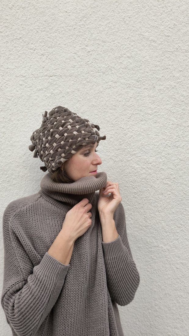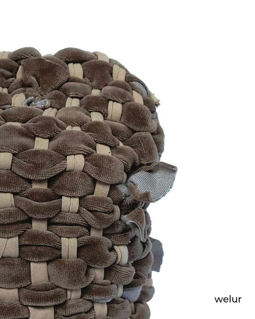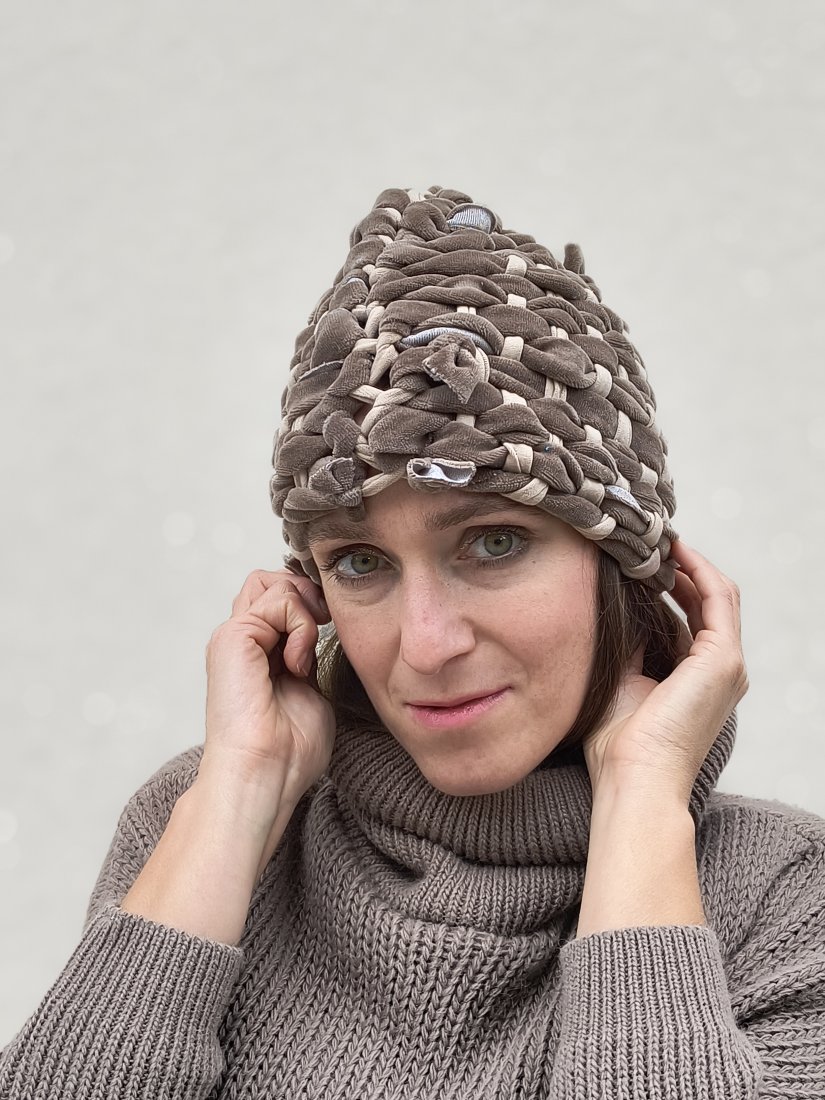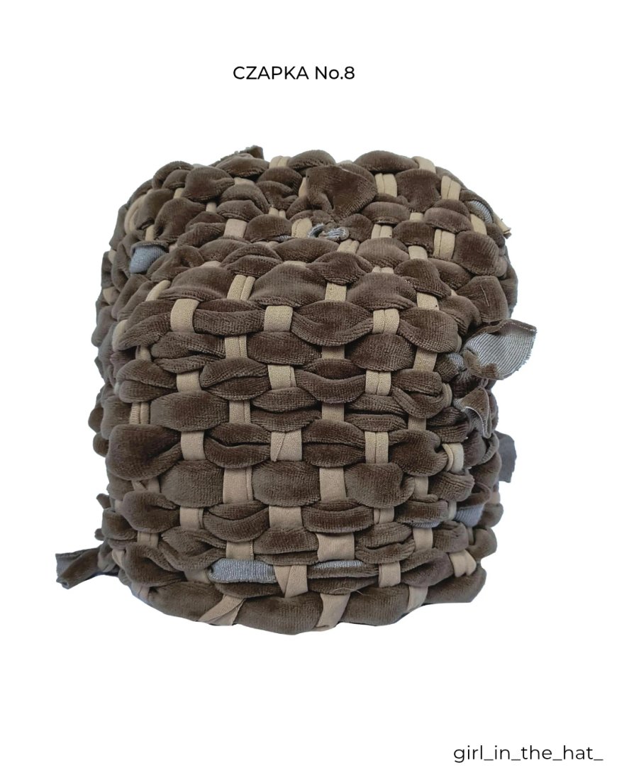 Piękna czapa, ręcznie wytkana na krośnie z pasów miękkiej i mięsistej tkaniny welurowej