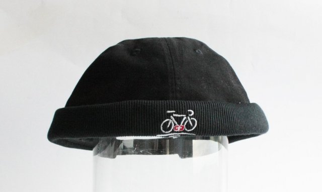 Czarna czapka z symbolem roweru. Z tyłu zapięcie na rzep, dzięki czemu obwód jest regulowany.