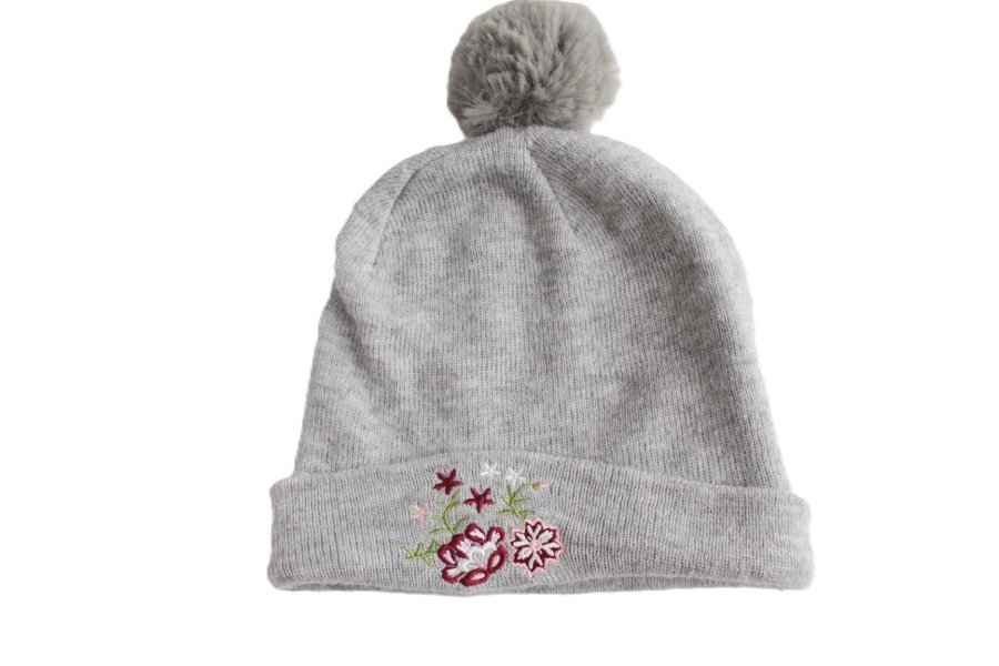 Ciepła czapka vintage z szarej dzianiny, ozdobiona puszystym pomponem. Można nosić w wersji wywiniętej lub nie.