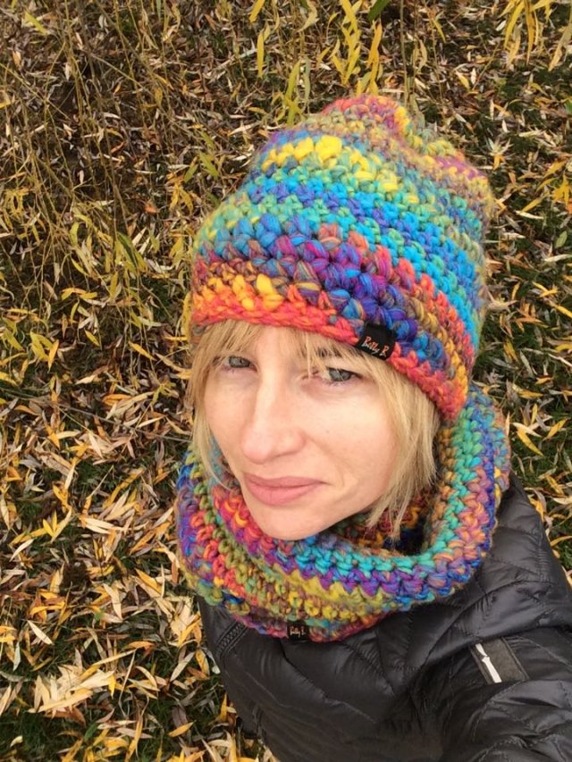 Ciepła czapka w kolorach tęczy, o przepięknym, zmiennym splocie, wykonana ręcznie z mieszanki wełny i akrylu. Pasuje do stylizacji boho, casual i bardziej eleganckich.