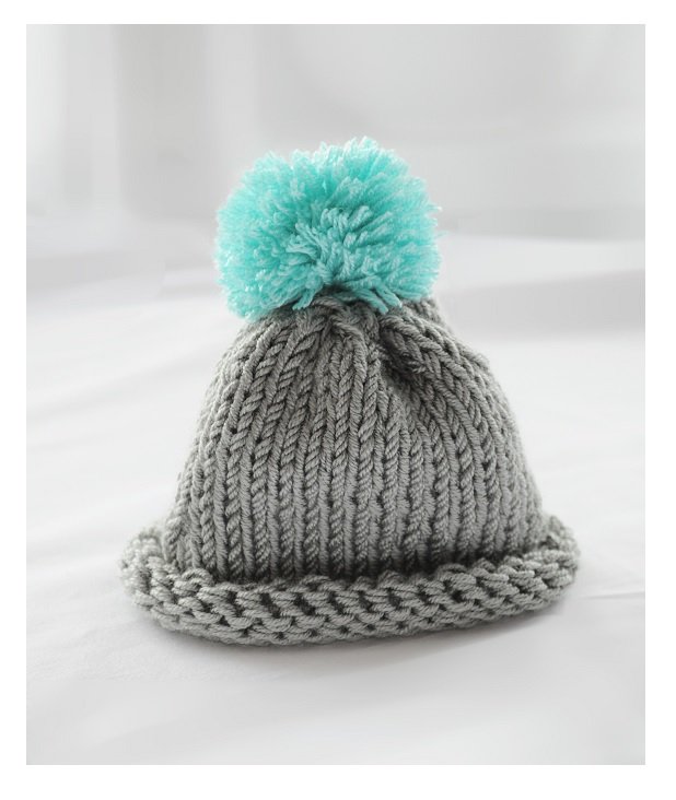 Mięciutka dziergana czapka dziecięca z wywijanym dołem, wykonana z włóczki akrylowej w kolorach szary i turkus. Na obwód głowy 40-45cm, głębokość ok. 19cm, rozciąga się. Polecam :)