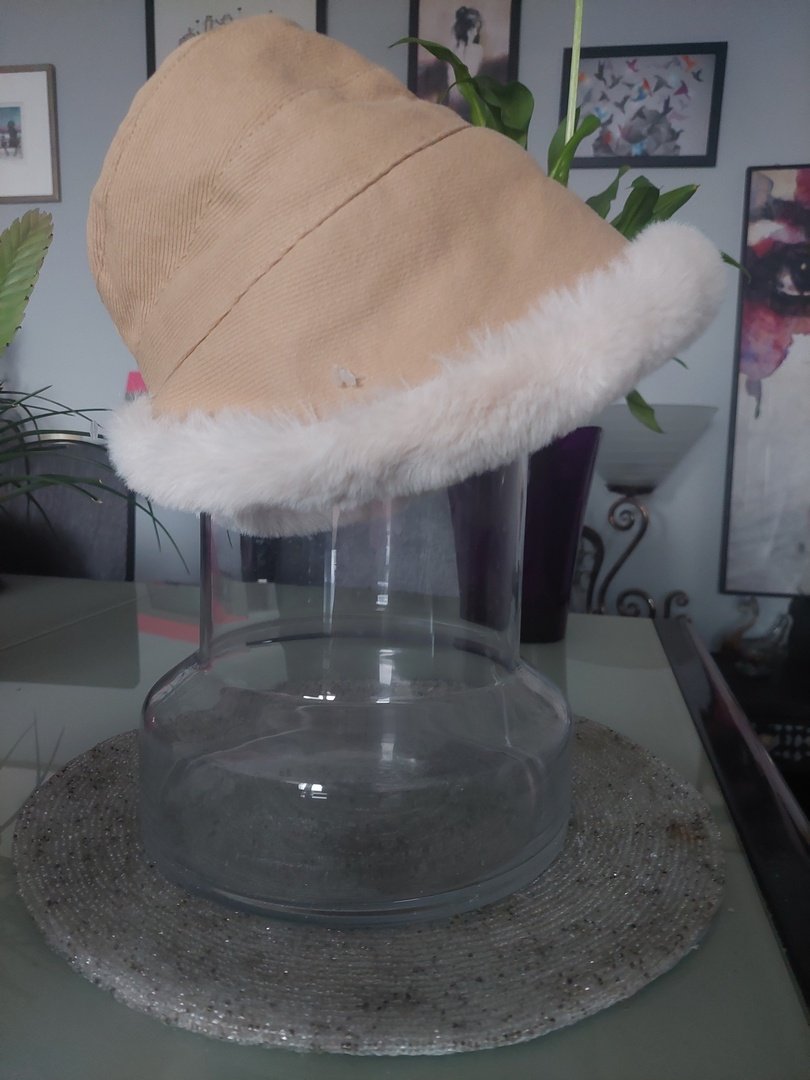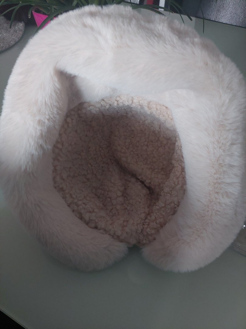 zimowy czapka w beżowym kolorze. materiał brak metek. Na zewnątrz jak sztywniejsza bawełna (poliester?) wewnątrz baranek, wykończenie z futerka rozmiar onesize, obwód wewnątrz ok 56cm. nie rozciąga się. stan bardzo dobry.