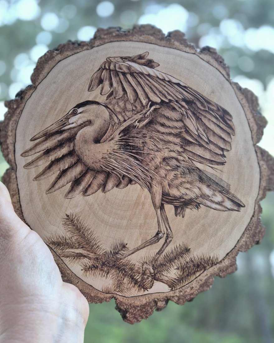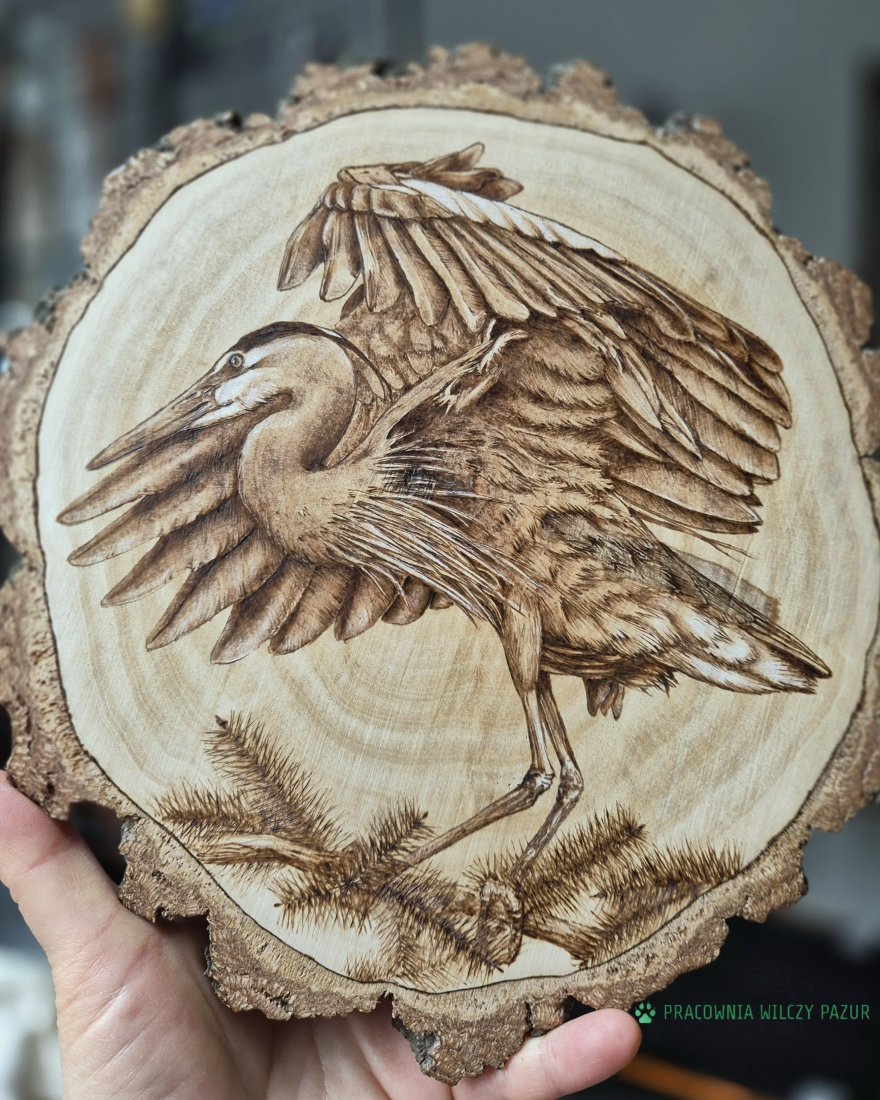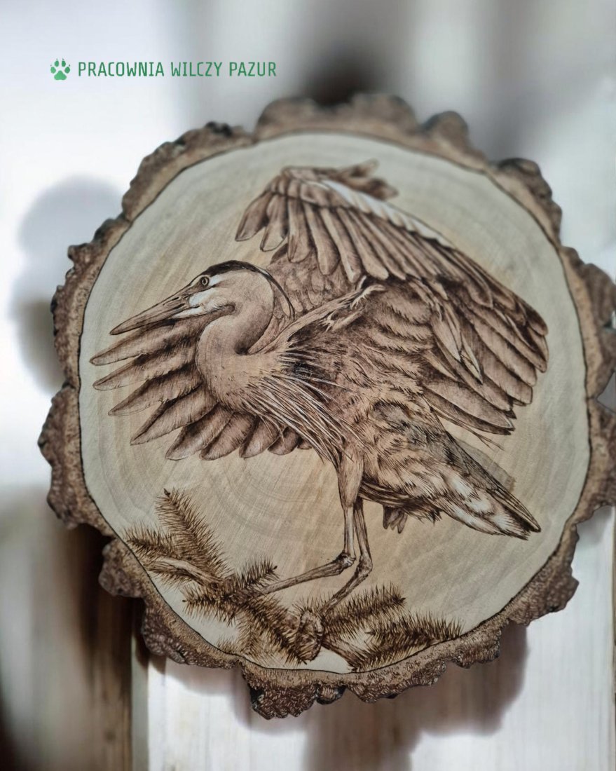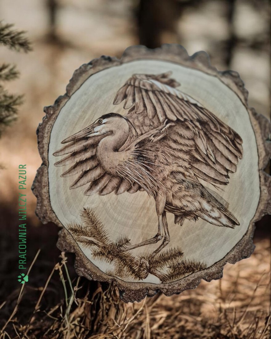 Czapla siwa – to piękny, majestatyczny ptak, symbol mądrości, cierpliwości i duchowego przewodnictwa. Ta czapla została wypalona przeze mnie metodą ręcznej pirografii na okrągłym plastrze brzozowym z korą, będzie więc wyjątkową, naturalną ozdobą ściany każdego miłośnika natury. Obrazek ma średnicę 25 cm i posiada z tyłu zaczep do zawieszenia.