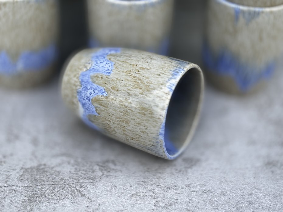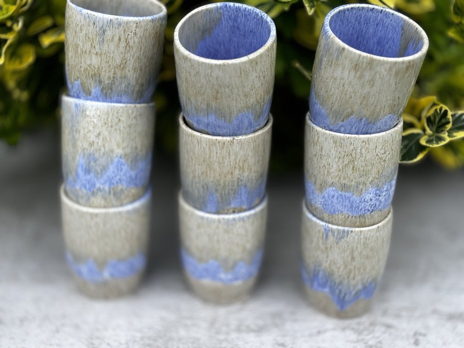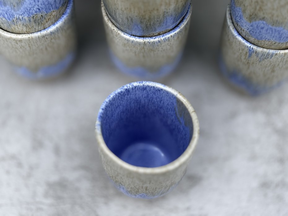 Ręcznie wykonana czarka o pojemności 250 ml, szkliwiona na połyskach w odcieniach nakrapianego błękitu oraz beżu. Subtelne przyjścia kolorystyczne oraz delikatne nakrapianie nadają jej unikalny charakter. Idealna do herbaty, kawy lub matchy. Każda sztuka jest niepowtarzalna, tworzona z dbałością o detale i rzemieślniczy kunszt.