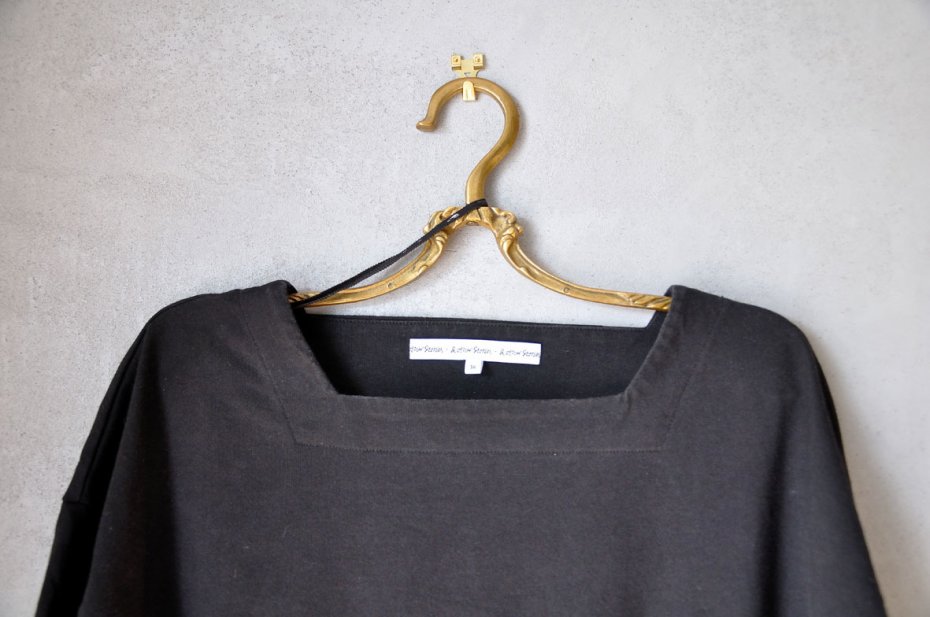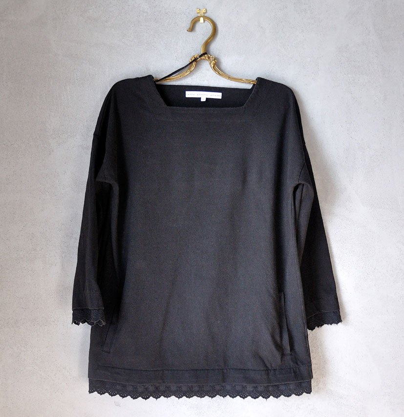 Ma bardzo ciekawy, geometryczny dekolt. Fason prosty, oversize. Obniżone ramiona.