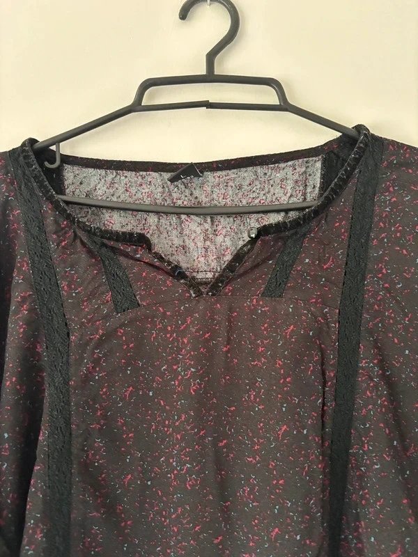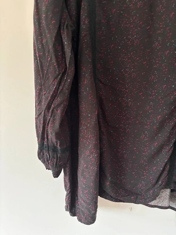 Czarna bluzka oversize w delikatny czerwono-różowy wzór. Zwiewny materiał, luźny krój, długie rękawy zakończone gumką. Dekolt w kształcie litery V z ozdobnymi lamówkami nadaje całości subtelnego charakteru. Idealna do stylizacji boho, vintage i casual.