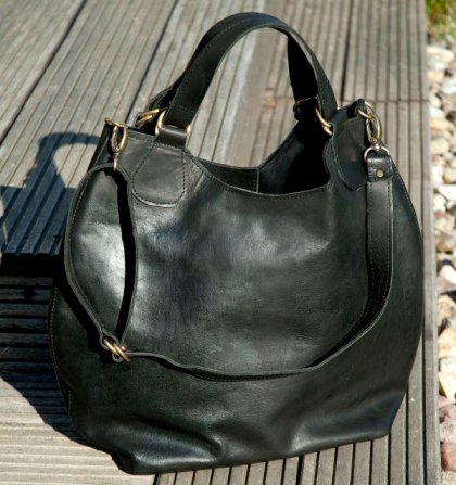 Duża czarna torba uszyta z gładkiej mocnej czarnej skóry naturalnej. Zapinana na zamek. Skóra matowa, sztywniejsza. Wewnątrz wyłożona podszewką, na podszewce 2 kieszonki małe i 1 na zamek. Do noszenia w ręku i na ramieniu, również na podwójnych uchwytach można nosić na ramieniu. (doczepiany pasek o regul. dł. - można nosić na skos), okucia ciemno złote lub srebrne (proszę zaznaczyć w z zamówieniu). Uchwyty można założyć ciasno na ramię. Wymiary torby: szer. 46 wys. 31 cm, gł. 14. Oczekiwanie 7 dni.