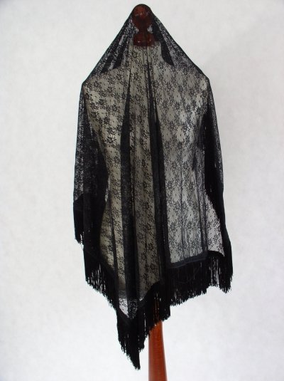 Kwadratowa chustka,syntetyk.Delikatna koronka,brzegi obszyte listwą z frędzlami.Stan bardzo dobry.Długość boku 90 cm.bez frędzli.