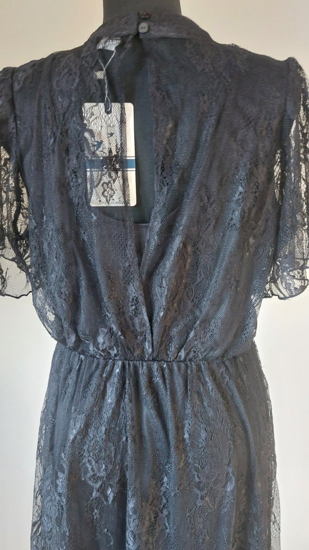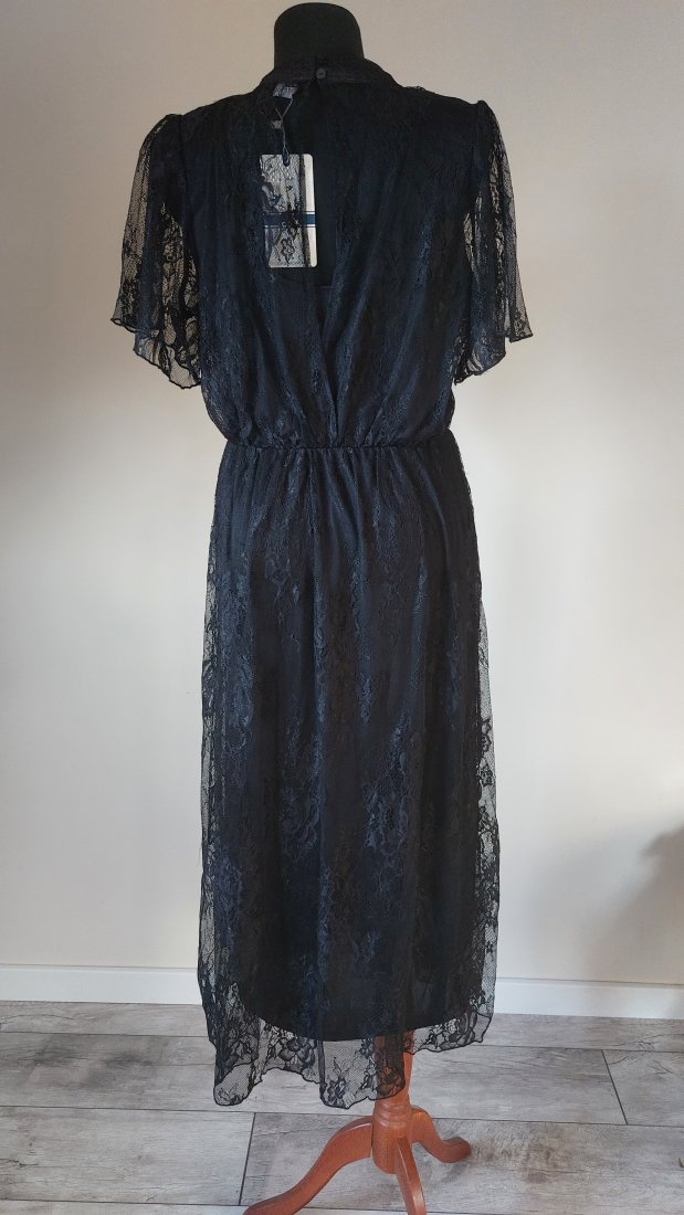 Nowa sukienka wykonana z koronki, rozcięcie na plecach, wewnątrz podszewka, w pasie gumka. Wymiary: