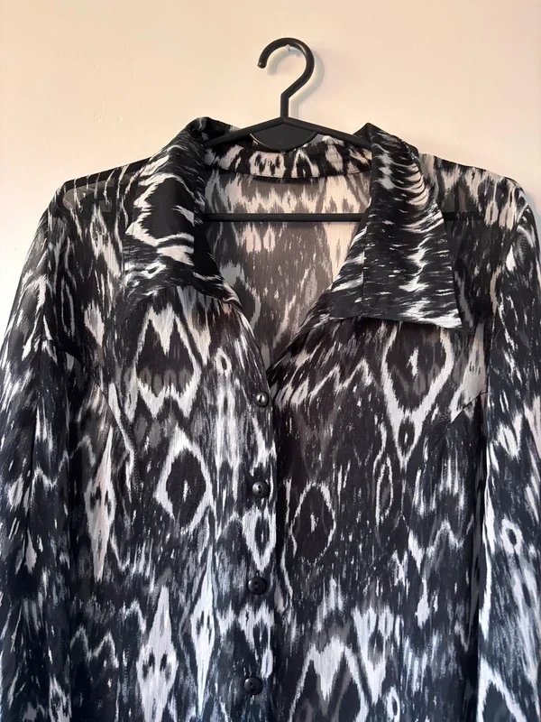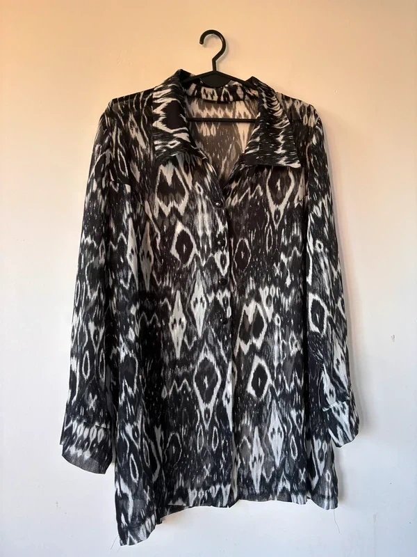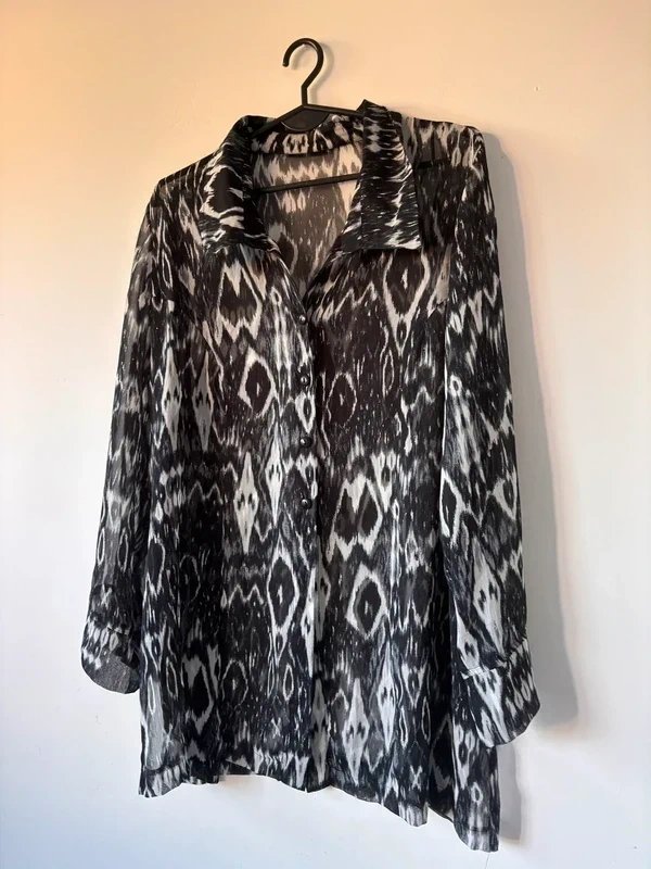 Lekka koszula w czarno-białym wzorze etnicznym, wykonana z przewiewnej, lekko błyszczącej tkaniny. Fason oversize z długimi rękawami i subtelnym kołnierzem, idealny dla miłośników artystycznych stylizacji. Dodaje charakteru każdej casualowej garderobie.