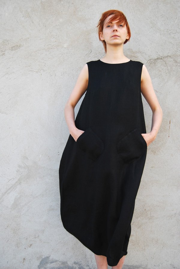Sukiena uszyta ze lnu ze skośnie naszytymi kieszeniami i ozdobną patką z tyłu. Charakteru nadaje jej nietypowe wykończenie dołu: