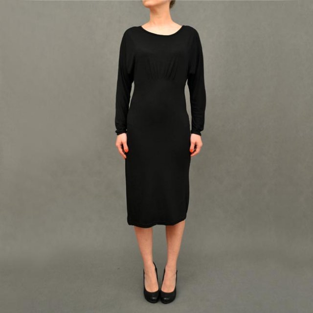 Świetna sukienka w czarnym kolorze o długości midi. Rewelacyjny fason - trochę w stylu retro - góra nietoperzowa, luźniejsza, reszta dopasowana. Polecam.