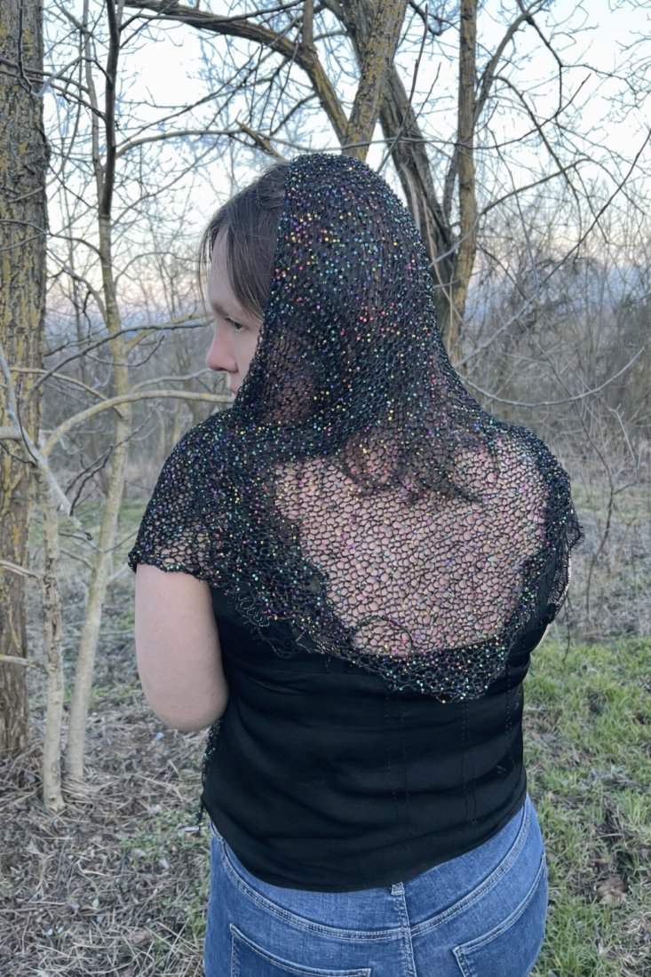 Ta wyjątkowa, trójkątna chusta (ok. 200 x 60 cm) to połączenie klasycznej czerni i subtelnego blasku tęczowych cekinów. Lekki, miękki materiał sprawia, że jest niezwykle komfortowa i efektownie mieni się przy każdym ruchu.