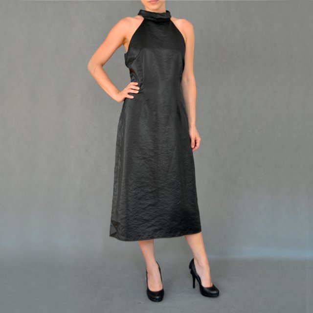 Czarna, prosta sukienka o lekko gniecionej fakturze i z lekkim połyskiem. Na stójce z kołnierzykiem, z tyłu zamek. Na podszewce. Polecam.