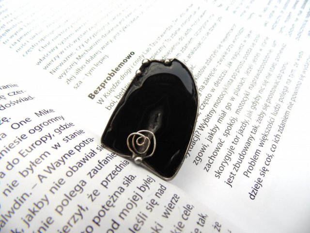 Pierścionek wykonany z miedzi, cyny i agatu. Obrączka posrebrzana, regulowana. Wymiary ok. 3,5 na 2,5 cm. Lekki.