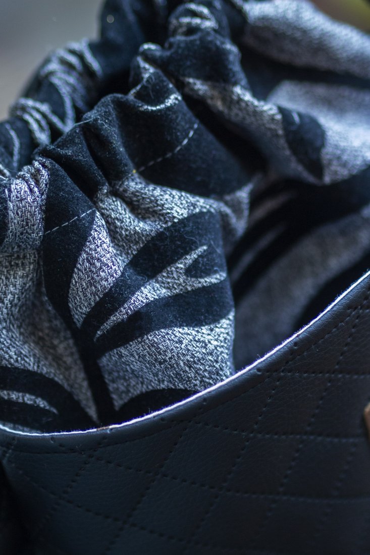 Wykonana z szaro-czarnej tkaniny we wzory. Z przodu oraz z na tyle torebki kieszenie (np. na telefon czy chusteczki) z czarnej pikowanej ekoskóry. W środku kieszonka zapinana na suwak.