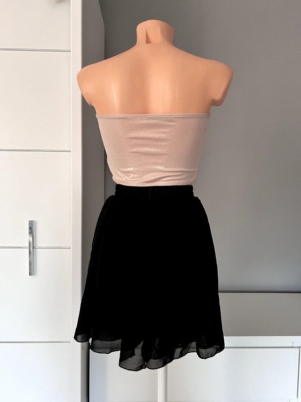 Czarna spódniczka z wysokim stanem kropka Ma gumkę w talii, dzięki temu idealnie dopasowuje się do sylwetki i nie odstaje. Niestety nie posiada metki z rozmiarem ale moim zdaniem jest to XS. Dzięki temu, że jest rozkloszowana to świetnie zagrywa mankamenty. Ma wysoki stan.